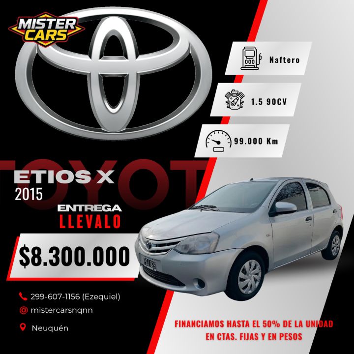 Toyota Etios X 1.5 2015, un hatchback práctico y confiable, ideal para la ciudad y viajes cortos. Destaca por su bajo consumo, mantenimiento accesible y la durabilidad típica de Toyota.