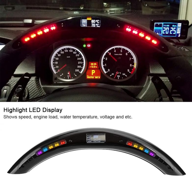 【Datos Dinámicos】El indicador de cambio LED muestra valores de aceleración lateral y longitudinal, así como tiempos de cuarto de milla y de vuelta de 0 a 60 mph, y muestra datos dinámicos válidos. Los LED brillantes muestran velocidad, RPM, vuelta, carga del motor, temperatura del agua, voltaje y más.