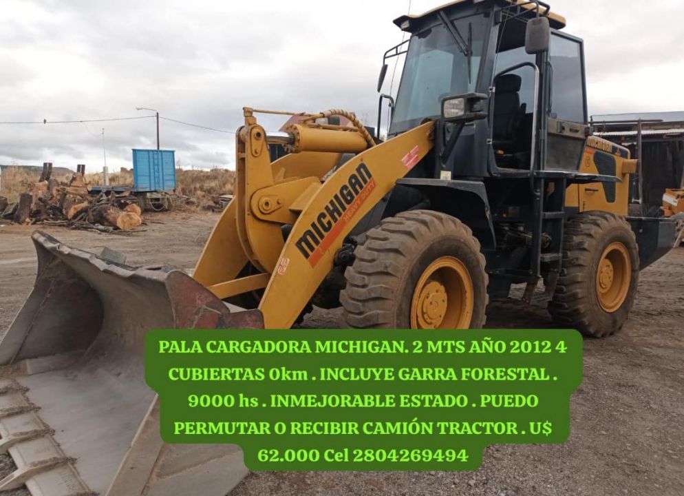 PALA CARGADORA MICHIGAN. 2 MTS AÑO 2012 4 CUBIERTAS 0km . INCLUYE GARRA FORESTAL . 9000 hs . INMEJORABLE ESTADO . PUEDO PERMUTAR O RECIBIR CAMIÓN TRACTOR . U$ 62.000 Cel 2804269494
